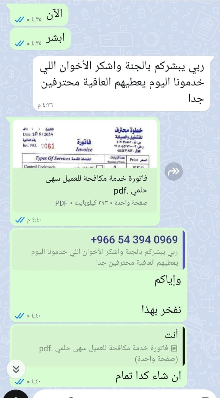 نعم، نستخدم مبيدات سعودية وطنية وامريكية ومن مصادر متنوعة مصرحة من هيئة الغذاء والدواء، وهي آمنة تماماً وعديمة الرائحة ولا تسبب الحساسية.